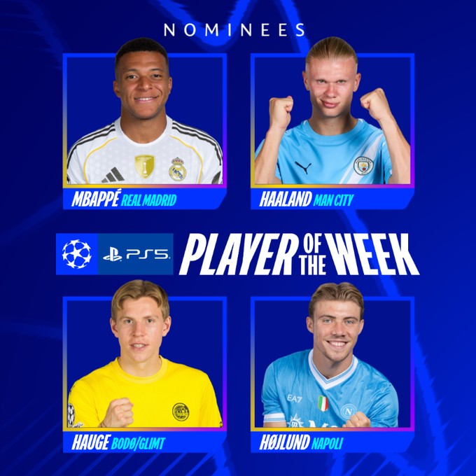 欧冠联赛阶段第二轮全部赛事已圆满结束,欧冠官方正式公布了本周最佳球员的候选名单,他们分别是姆巴佩、哈兰德、海于格以及霍伊伦。